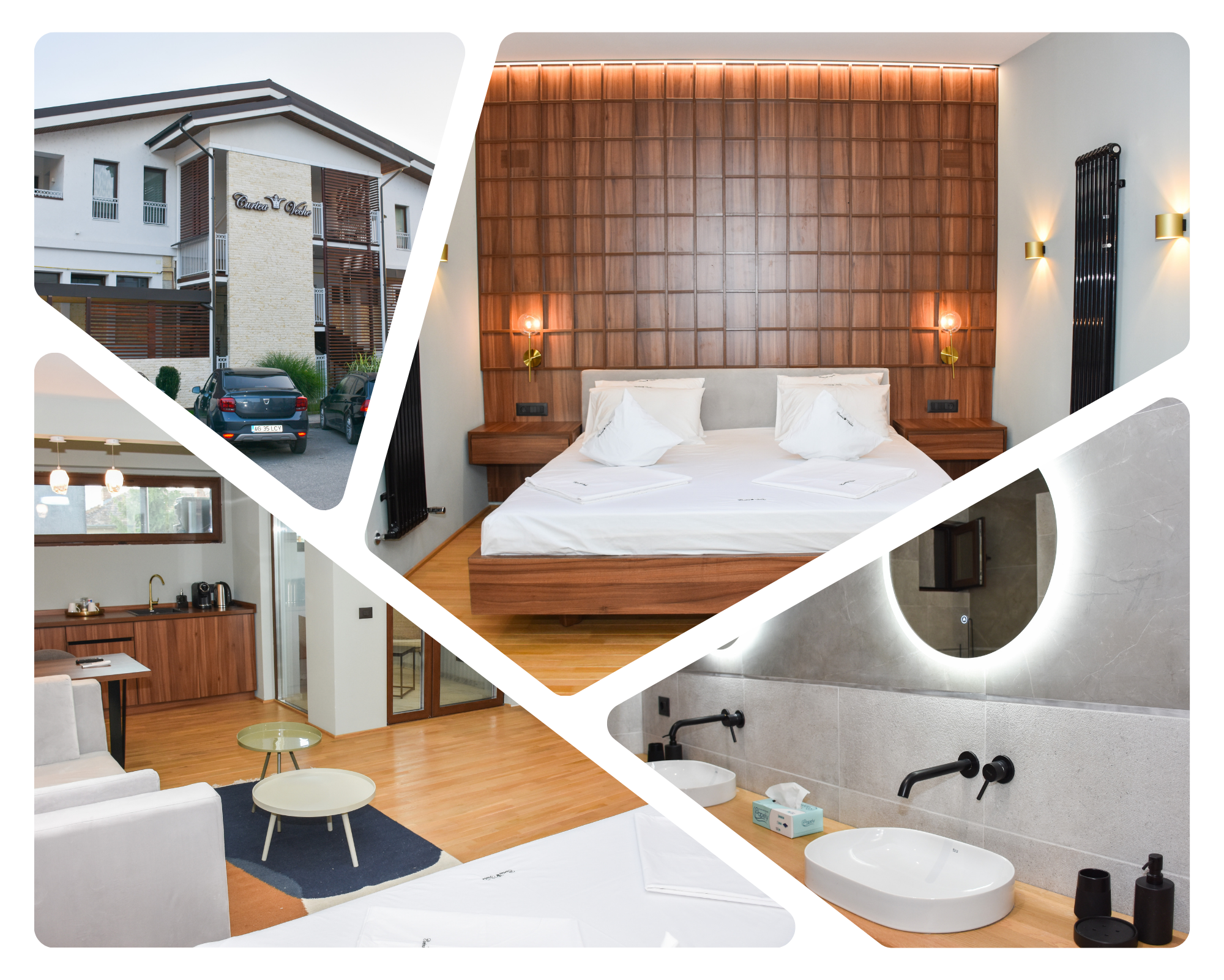 Camerele oferă zone comune cu living şi locuri spaţioase pentru luat masa, şi parcare proprie. Vă punem la dispoziţie restaurantul Curtea Veche unde va puteti bucura de preparate delicioase pe durata sejurului.